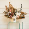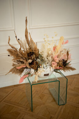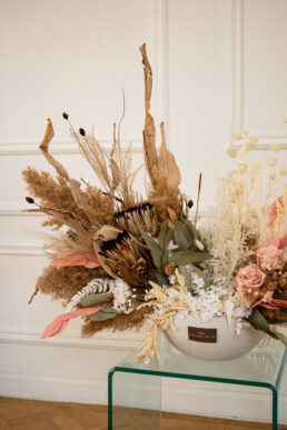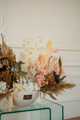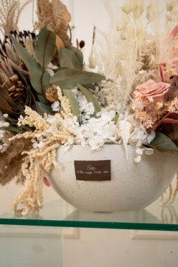 У складі стабілізовані квіти та сухоцвіти. Композиції закріплена у бетонному кашпо, на якому нанесена фраза від каліграфа.