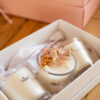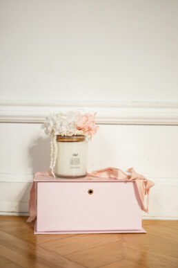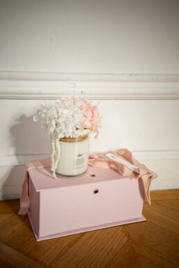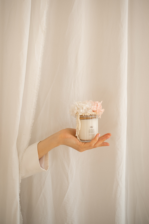 У складі свічки : натуральний соєвий віск, сертифіковані аромаолії, бавовняний або деревʼяний ґніт, кришечка свічки прикрашена стабілізованими квітами та сухоцвітами.